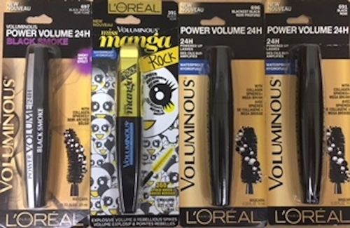 This lot includes different L'Oreal Voluminous Mascaras like Power Volume and Miss Manga in Black Smoke, Blackest Black, and Black Shades. All items are brand new and retail-ready.