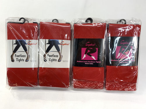 This Lot Includes 216 Pairs (108 Solid and 108 Bottom lace) Pairs of Lady Footless Tights. Color: Red. Single Packs. One Size Fits Most. Brand New.