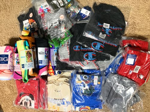 This lot includes Champion sports clothing, Disney Beach Towels, children's tops and bottoms and more. All items are brand new and retail ready with original tags and most are in original plastic.