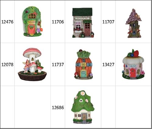 This lot includes 74 pieces of 7 unique Lighted Fairy Garden Houses from Exhart. Houses includes are Carrot House, Flower Shop, Cupcake House, Mushroom House, and More. Heights range from 6" tall to 14" tall. Battery-Operated designs use a timer; auto on for 4 hours; auto off for 20 hours then back on again (do not include the batteries). Best for indoor use. All items are new and retail-ready.