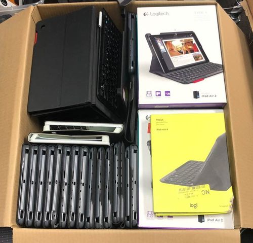 This lot includes 54 units Logitech iPad Bluetooth Keyboards, Cases and more. These are uninspected customer returns and sold as is. All of our customer returned inventory has not been inspected by our facility. Units may have return labels and/or stickers. As customer returns, there is no guarantee regarding functionality. See manifest for products breakdown.