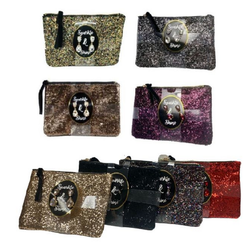 This lot includes 72 New SPARKLE AND SHINE - PURSE/MAKE-UP BAGS - COLORS MAY VARY Retail as shown