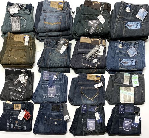 This lot includes 28 units of New with Tags Men's Assorted Fashion Denim Jeans. Assorted Brands, Sizes and Washes. See the manifest for sizes breakdown.