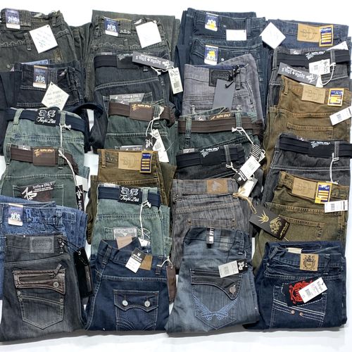 This lot includes 25 units of New with Tags Men's Assorted Fashion Denim Jeans. Assorted Brands, Sizes and Washes. See the manifest for sizes breakdown.