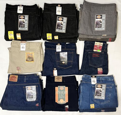 This lot includes 15 units of Assorted colours and sizes of Men's Jeans. Brands included: Dickies, Wrangler. Colours Included are Denim Blue, Dark Denim, Black, and Beige. Please see the manifest for the inventory breakdown.