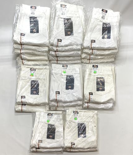 This lot includes 25 units of New with Tags Men's Assorted White Denim Work Jeans from Dickies. Genuine Dickies Jeans. Sizes: 30x30, 30x32, 33x30, 34x34, 38x32, 38x34, 40x30, and 42x30.