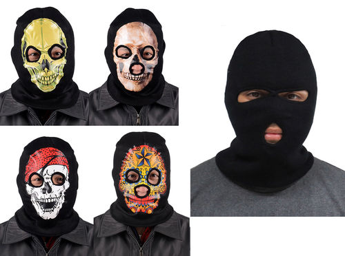 This lot includes 120 units of Men's Outdoor Sports/Halloween Full-Face Balaclava Masks in Assorted Styles. All items are in Original packaging, All items are brand new and ready for retail. Some features are Eye cutouts allow for good visibility, It is very soft and lightweight, can fit comfortably in your pocket, Keeps your face, ears, and neck warm with maximum comfort and protection from the cold, snow, wind, and dust, Great accessory for costumes and outdoor activities such as motorcycling, snowmobiling, etc. Material: Knit, Size: One Size. See the manifest for products breakdown. NOTE:NO AMAZON SALE