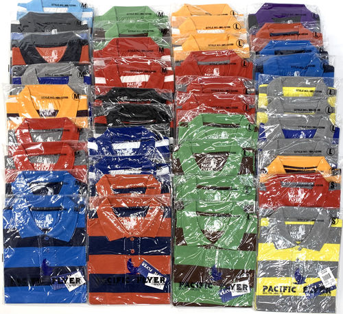This lot includes 40 units of New with Tags Men's Assorted Fashion Pacific flyer Polo Shirts. Assorted Colors and Sizes. Sizes included are S, M, L.