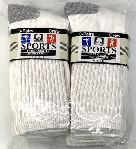 This lot includes 88: 3-Packs of Men's White/Gray Crew Socks. 3 pairs per pack. Brand: Sports. Size 9-11. All items are Brand New.