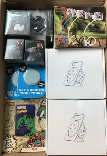This lot includes shelf pull electronics and electronic accessories by Microsoft, Gear4, Polaroid, Popsockets and many more.