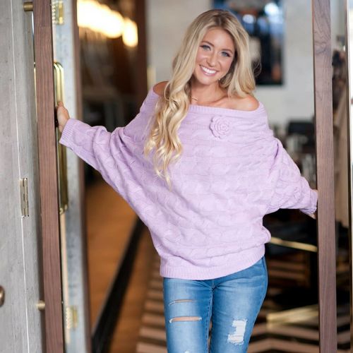 This Lot Contains 1000 Rose Knitted Sweater. 700 In Cream colour 350S /M + 350 L/XL and 300 In Pink Lavender100 S/M + 200 L/XL. Rose sweater with soft knitted mohair- like material made just for us. This material is SOFT and does not itch. Does not pill. Fabric made of 77% acrylic, 20% nylon and 3% spandex. Perfectly Sized-US Contemporary Sizing, Batwing 7/8 Sleeves, Removable Flower. Model is 5'9". Bust 34", Waist 25", Hips 35". Wearing size S/M. These are all brand new and wrapped.