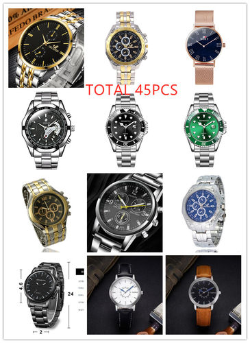 This lot contains 9 different styles of fashion watches. Total 45pcs watch. For Daily Use Or Perfect Gift For Any Purposes. Each watch is Packed in opp bag, Ready For Retail.