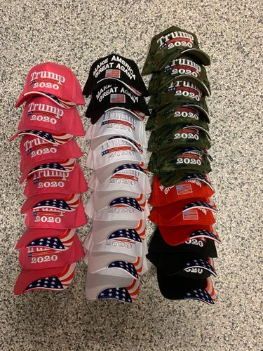 This lot features 60 Units of Mixed Colors/Designs Trump 2020 Snapback Baseball Hats. You will get 12 of each model/design shown, 12 pink, 12 white, 12 black, 12 red, and 12 camos. All new in packs, only the white, camo, and pink have eagles on back. the red and black do not. These are high-quality hats and sell quite well in person or online.