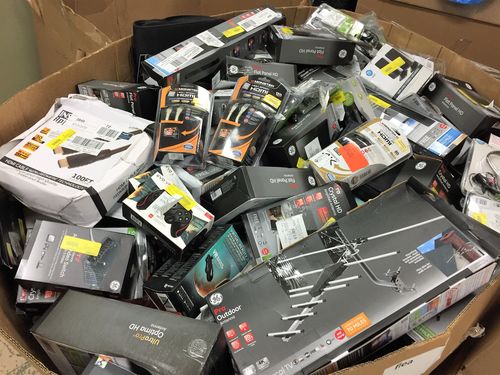 This lot contains lots of Microsoft Xbox Stereo Headsets, Smartphone Accessories, HD TV Antennas, Speakers and Much More. Please see pictures and manifest. All items in this lot are untested, big box store returns. Some packaging may have labels or stickers. Some items may have damaged or missing packaging, missing parts or have technical issues. Sold AS IS.
