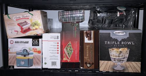 This is a mixed lot of shelf pull small appliances and kitchen accessories from Chef's Counter, FISHER PRICE, HAMPTON, and More. See the manifest for products breakdown.