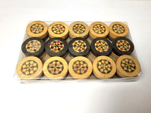 This lot includes 25 Sets of Handcrafted Wood Mosaic Backgammon Checkers for your Backgammon. Each set is packed individually and includes 30 pieces of Handmade Backgammon Checkers for Backgammon Board Game and mosaic Handcrafted Wooden Backgammon Pieces. Perfect for standard-size backgammon boards. Fine Workmanship made of pine wood.