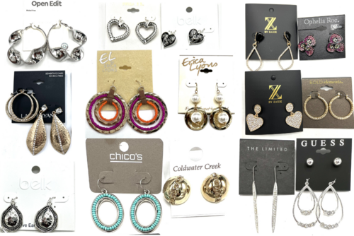 This lot includes 50 pairs of Name Brands + Designer Earrings. You will receive all these Designer and Name Brands below 100s OF DIFFERENT STYLES! Macy's, Nordstrom, Express, Ericha Lyons, Premier, Mix It by JCPenny, Bold Elements by JCPenney, etc. Bay Studio etc. 50 pairs per box. All new -All individually packaged. Each piece has a retail price and is barcoded. All retail prices range from $12.99 to $29.00 for a pair.