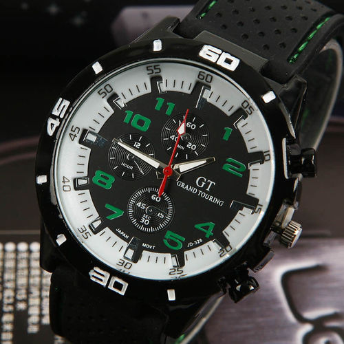 This lot includes New & High-Quality Generic Men's GT F1 Grand Touring Sports Watches. Colours: 5-7 assorted colours with black or white dials. Features: Analog dial display, Quartz movement, Band material: silicone/rubber, Dial/case material: stainless steel, and Measures approximately 9.8" long with a case diameter of 1.8". All watches come individually bagged and retail ready! Note: the small chronograph dials inside, as well as the buttons outside, are for decoration only.