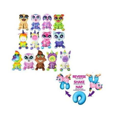 This lot includes 48 New PLUSH - REVERSE A PLUSH - 14" ASSORTED PLUSH WHICH TURNS INTO A - TRAVEL PILLOW with retail tags, mixed from those shown in pics.