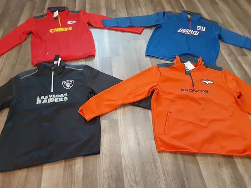This lot includes 36 NFL Jackets Md zip Multiple Teams logo. Teams included: you will receive at least 5 team logo as shown in the pictures, (you might not receive all team logo shown). Colours & styles: assorted as shown in the pictures. Sizes: M- 2xl (mostly L, XL & 2X). Fabric: 97% polyester 3% spandex. Brand: only NFL brand, (no other brand or non branded). Packaging: Original. Tags: most of the units with the retail tags 80%-95%. Graphics; assorted as shown in the pictures. Gender: Unisex. 90% off retail price. We will try to include all team logo assorted even, but you might get more of one team than the other. Pictures are taken direct from the item, what you see is what you get. This branded lot is limited, so take advantage while it last. This branded merchandise guarantees a high-profit margin. No junk, non-branded to make the lot look larger