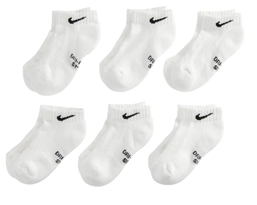 This lot contains 120 Units of Nike Performance Cotton Low Cut Youth Socks (For Ages 3-5). 3 Pairs/Unit and lot holds a total of 360 Pairs. Some features are Nike Moisture Wicking Cotton Socks, Low Cut Youth, Shoe size- 3 to 5 years. All items are brand new with original packaging and ready for retail.