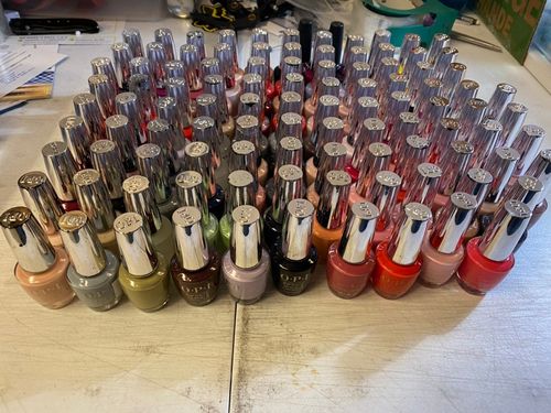 This lot includes 104 OPI Nail Polish in Assorted Colors. Dozens of assorted colors, have checked them all. All are sealed but some bottles are scuffed up. These are shelf pull conditions.