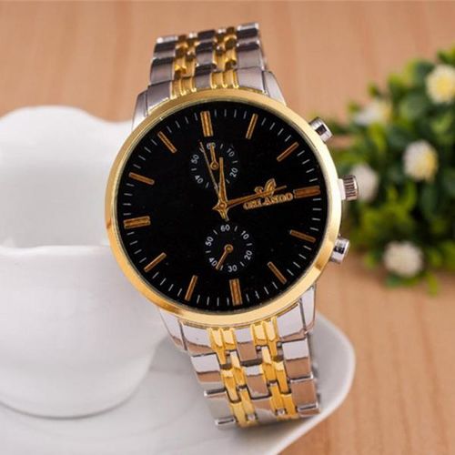 This lot includes New Jewelry - 25 Luxury Men's Stainless Steel Sports Watches. Colors: silver band with gold accents, and different dial colors, as shown in the pictures. Features: Case material: stainless steel/alloy, Band material: stainless steel, Dial material: stainless steel/alloy/glass, Analog dial display, Quartz/battery movement, Case diameter: approx. 1.6", Band length: approx. 8.6" (including case), and Band width: approx 0.9". Note: the small chronograph dials inside, as well as the 2 buttons outside, are for decoration only.
