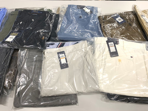 This lot contains different Pants, Shirts, Cargo Shorts, Chinos, Kahkis, Polos, and More from Tommy Hilfiger, Polo Ralph, Levis, Dockers, Greg Norman, and Many More. This lot is shelf pulls from a famous dept store. Item has been polybagged for protection, in new condition, and ready for retail.