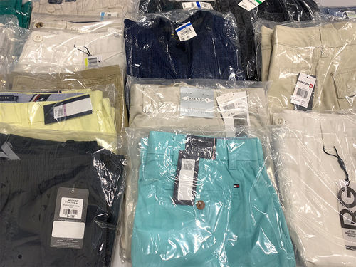 This lot contains different Pants, Shirts, Cargo Shorts, Kahkis, Track Pants, and More from Tommy Hilfiger, Hawke Co, Club Room, Alfani Mens, Geoffrey Beene, and Many More. This lot is shelf pulls from a famous dept store. Item has been polybagged for protection, in new condition, and ready for retail.