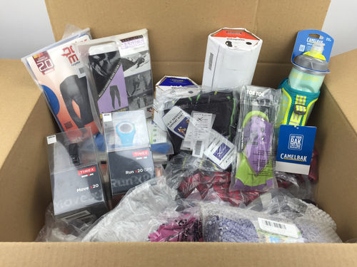 This lot includes various running gear such as socks, shirts, pants, bottles, and more from Patagonia, CamelBack, North Face, and more! All of the items are new and in their original packaging.