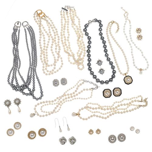 50 Pieces lot of Faux Pearl Necklaces and Earrings. These Necklaces and Earrings are all high quality. Necklaces are all hand-knotted glass-based pearls, both White pearls and Gray pearls. All have fancy clasp some with crystal stones. Excellent Quality! Most of the earrings ( not all) are Clip Earrings which are very hard to find nowadays, some with crystal stones has shown. Most match with the necklaces as well. These are some of the best quality faux pearls in the USA. You will receive exactly the items shown in the picture.