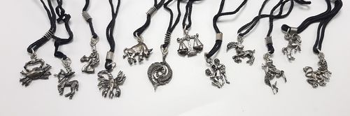 This wholesale lot includes complete sets of horoscope necklaces. The pendants are full figural metal and in pewter tone with light rope necklaces. They are being sold in complete sets of 12. This lot includes 4 dozen sets (48 Sets or 576 Units)