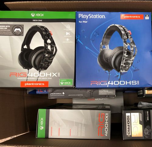 This lot includes 25 units of different Plantronics RIG Headsets. The lot includes 10 Plantronics RIG 400HS for Sony PlayStation 4, 10 Plantronics RIG 400HX for Microsoft Xbox One S, and 5 Plantronics RIG 500 for PC. All items are uninspected returns fro customers and sold as is.