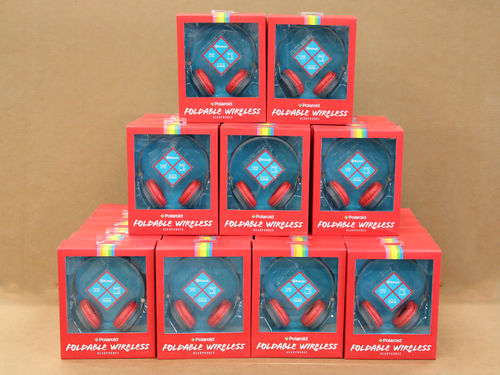 This lot includes 34 units of Red Foldable Wireless Headphones by Polaroid. These all are brand new in packaging and retail-ready.