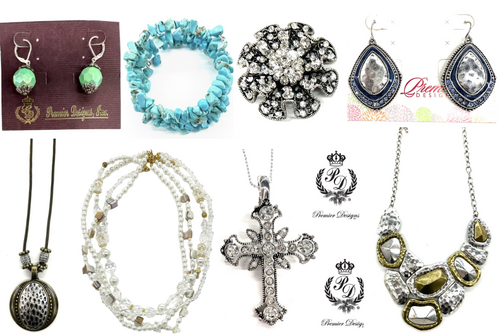 This lot includes 45 pcs of Premier Designs Necklaces, Bracelets, Earrings & Brooches - 15 different styles. You will receive 3 pcs of each style shown in the pictures. 15 necklaces, 21 earrings, 3 bracelets, and 6 brooches. All new not store returns.