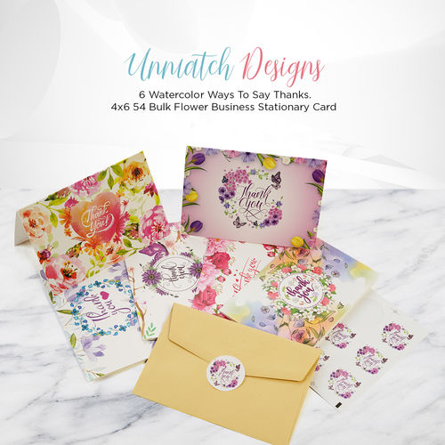 This lot includes 36 Boxes of Floral Premium Bridal Shower Thank You Cards with Matching Stickers. Each Box contains 54 Cards in Six Watercolor Designs by Award Winning Artists. Soft MATTE Finish on Thick Luxurious Card Stock with Brown Kraft Envelope. Each 6x4 inch size Cards are Blank Inside thus allows plenty of room for long messages or a photo. All items are brand new in original packing and retail-ready.