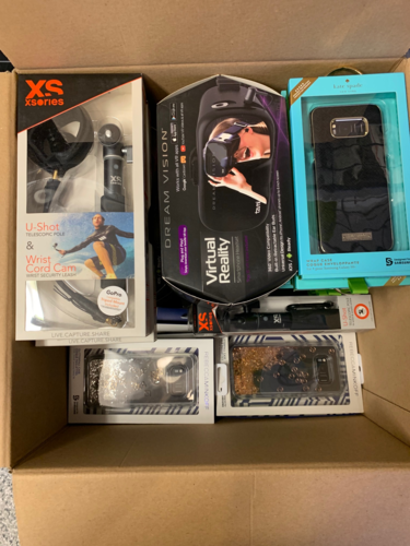 This lot includes 75 units of Premium Small Electronics and Phone Cases. Premium Rebecca Minkoff Phone Cases Glitter Fall Case for Galaxy S8 & S8+ in silver and Gold (See Pics) and Kate Spade Hardshell Case for Galaxy S8 - Black/Rose Gold Striped, Tzumi Premium VR Headsets with Built-in Headsets, Xsories Action Camera Wrist straps, new, black, Xsories 19' Go Pro Action Camera Sticks, new, Black. UPC Codes in retail boxes can be sold on Amazon. All items are brand new. Please see the manifest for products breakdown.