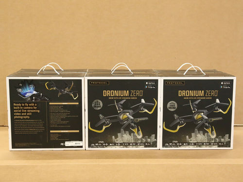 This lot contains Dronium Zero with Live-Streaming Camera Drones from Protocol. Dones are still in factory sealed boxes and retail-ready.