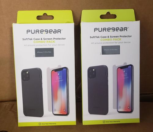 This lot includes New in retail box 100 PureGear SoftTek Case & Screen Protector Glass Combo for iPhone 11 Pro in Black. Features: Lightweight and slim style case, Silicone outer shell and inner liner for added protection, Functional Metal Buttons, and Touch and swipe precision screen protector that is scratch resistant and has a case-friendly fit.
