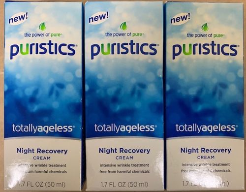 This lot features Puristics Totally Ageless Night Recovery Cream for intensive wrinkle treatment, free from harmful chemicals. All items are shelf pulls and listed as like new.