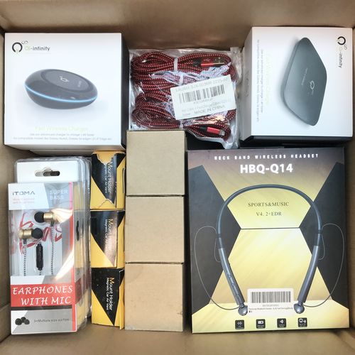 This lot includes Wireless Chargers, Earbuds, Car Mounts and more by ITOMA, Iluv, Qi-infinity, Gear4, and More. See the manifest for inventory breakdown.