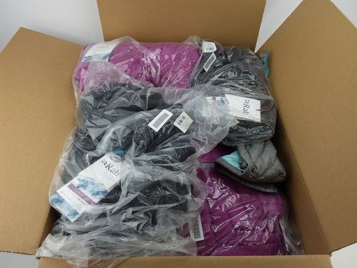 This lot contains various Men and Women's jackets from RAB with different sizes and styles. All of the jackets are brand new and in their original packaging (retail-ready).