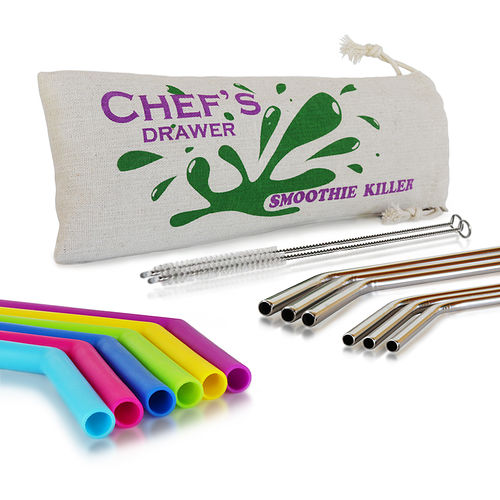 This lot includes Set of 12 pcs of reusable straws. 6pcs silicone ID 0.35in OD 0.45in - bent multicolor straws. 3pcs stainless steel straws ID 0.2in OD 0.23in bent metal straws. 3pcs SS metal ID 0.25in OD 0.31in bent metal straws. *straws are approximately 10 inches long. 2pcs cleaning brush. Package: 1 cotton bag (pouch), natural color with print.