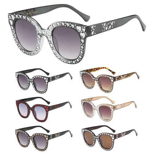 This lot contains different Rhinestone Heart Eyewear Sunglasses in an Assortment of Colours and Designs. All items are new and retail-ready.
