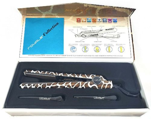 This Lot Contains Professional Grade Royale PRO Giraffe Print Metro Hair Professional Ceramic Straightener Iron Sets. The Royale Metro Set Collection features a classic 100% ceramic hair straightener with heating elements of nano-silver technology. The Nano Silver particles are embedded in the ceramic flat iron plates to inhibit bacterial growth; therefore, protecting the hair cuticles from damage and cleaner results. Features are 100% Ceramic Plates, Nano Silver Technology, 3M Professional 360 Degree Swivel Cord, and 110v to 240v Universal Voltage: Guaranteed to work anywhere in the world. All items are Brand New, Unopened, in Master Cartons, and ready for retail. Package Contents are 1 Royale Tourmaline Soft Touch Ceramic Flat Iron, 2 Royale Professional Hair Clips, and Warranty & Safety Notes Brochure.