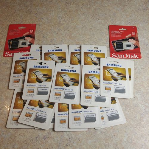The lot includes 16 units of Samsung 128GB SD Cards and 2 units of 32GB Sandisk SD Cards with adapters. See manifest for products breakdown. All items are brand new and retail-ready