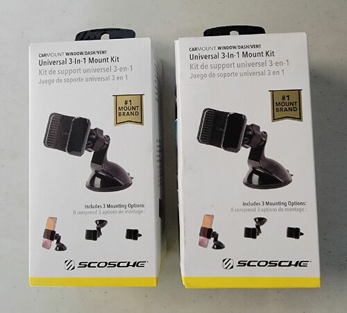 This lot includes Scosche Universal 2-In-1 Car Mount for Smartphones New in retail box By Scosche. Universal 2 in 1 Car mount for smartphones. 360-degree adjustable design. StickGrip suction cup for window or dashboard. Adjustable up to 3.5" wide. The sticker price is $24.99 ea,