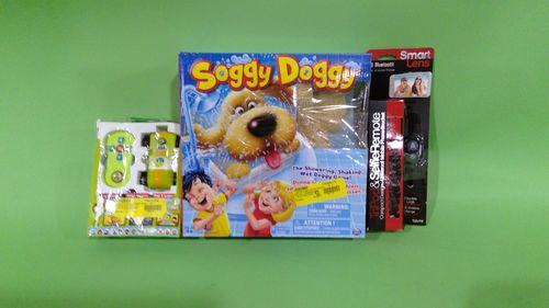 This lot contains different Selfie Sticks, Tripods, Board Games, and More Kids Toys from Soggy Doggy, Tzumi, WB Games, EMATIC, and More. All of our customer return inventory has not been inspected by our facility. Merchandise has been sold to an end user and returned through a retail chain, manufacturer and/or distribution centre. All images are a representation of the actual merchandise. Units may have return labels and/or stickers.