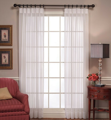 This lot includes sheer pinch pleated drapes. Color is White or Ecru. sizes include: 48x63 48x84 96x63 96x84 - Each drape is sold as a pair. (you get a left panel + a right panel) - The hooks shown to hang the drapes are NOT included - The stated sizes includes both panels (so the 48" wide pair includes 2 panels that are 24" wide each) - 100% machine washable polyester