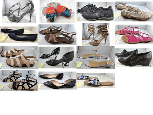 This lot includes different Shoes from Annie, Crown & Ivy, Marc Fisher, Wear.ever & More. Mostly shelf pulls with one customer return. Shoes have been removed from boxes and polybagged as shown.